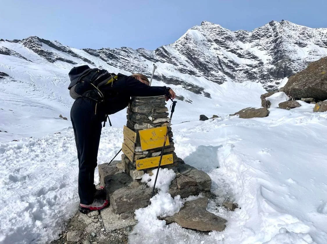 Jeg er blevet ven med bjerget, vi har en relation nu 😍 Det her er mit nye miljø og jeg trives. Bjergstierne og jeg snor os afsted op og ned og over stok og sten gennem skiftende scenarier. Bjerget har fundet sin tålmodige og omfavnende side frem… jeg ligeså, det er et match in heaven… lige indtil vi når stigningen til passet. Pludselig er vi begge lidt trængte. Bjerget fordi det under dets smukke sneklædte ydre gemmer på et forfærdeligt rod af sten og sprækker og ikke selv kan beslutte sig for, hvad vej det vil vise… mig fordi jeg er rasende skuffet over at al min energi og velvilje og tålmodig blot bliver belønnet med et ekstremt pres på at være modigere, mere tålmodig og endnu mere tilpasningsdygtig. Og jeg har lyst til at skrige “jeg kan ikke mere!!!”