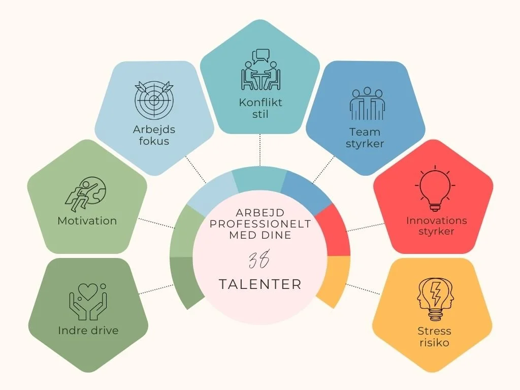 Med en TT38® Talent Test, kommer du til at arbejde i dybden med din unikke og personlige talentsammensætning, både dine toptalenter og dine non-talenter. Du får blik for, hvilke opgaver, der giver dig energi og gør dig effektiv og hvilke opgaver, der dræner dig for energi og gør dig mindre produktiv. Du får indsigt i og forståelse for dine kognitive evner og mønstre, din indre drivstyrke, din motivationsstyrke, din konfliktstil, din teamstyrke og din stressrisiko. Det er gode kort at have på hånden, når du ønsker at arbejde med din personlig udvikling, med medarbejder- og ledelsesudvikling, arbejdsglæde, karriere og med jobsøgning.